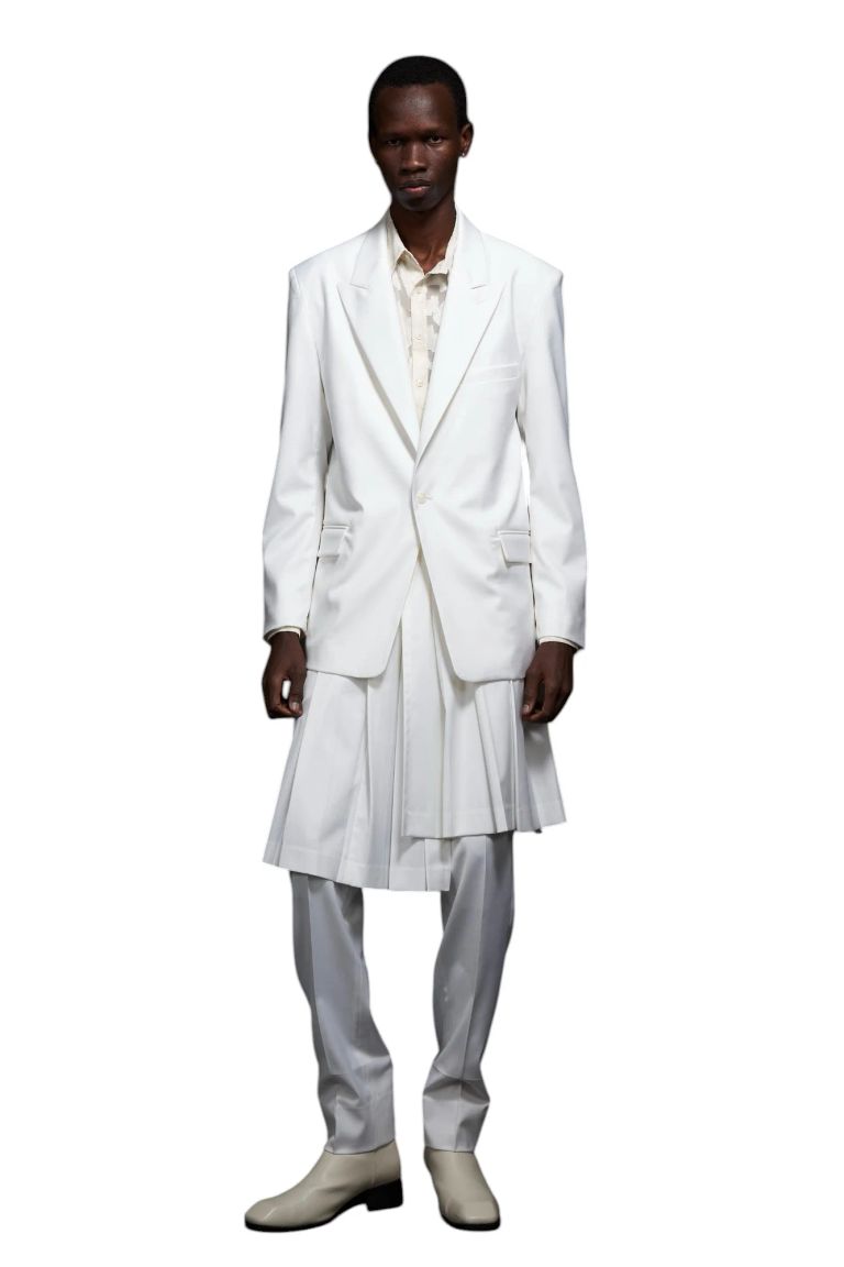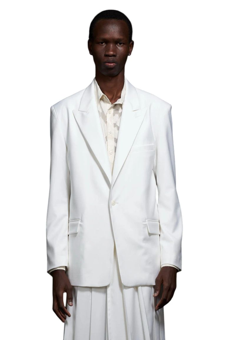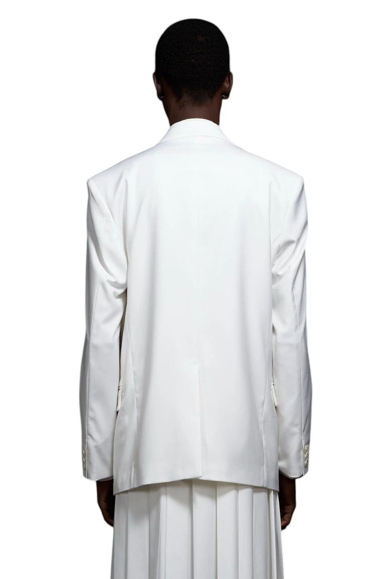 • ショルダーライン: 圧倒的な存在感を放つ、構築的な肩の仕立て。